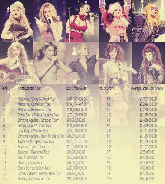 O site ATRL publicou os "16 mais bem sucedidas turnês de uma artista feminina." Na classificação, a nossa Shakira está localizado em 16 º lugar com a turnê "Fijacion Oral" (2006-2007). A turnê com 116 shows total que arrecadou 100 milhões de dólares. Então deixamos aclassificação completa: